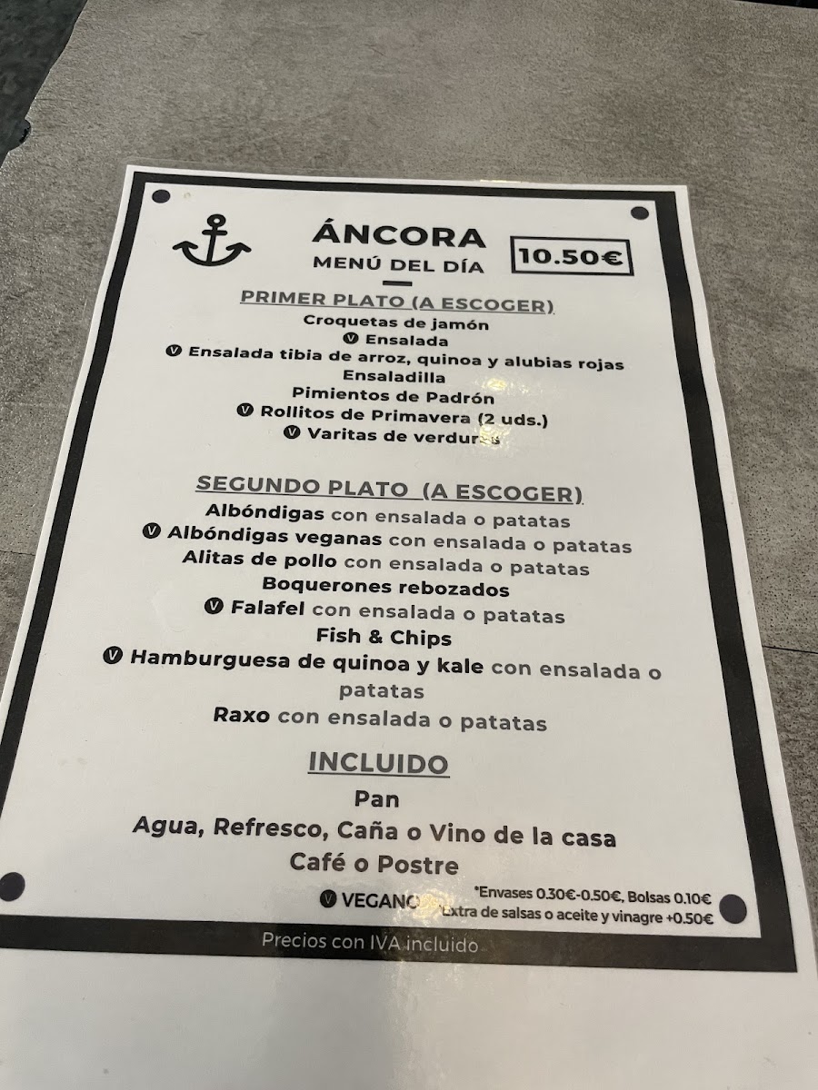 Introducing the menu at Ancora, a charming café nestled in A Coruña, Spain, where culinary delights await every visitor. The menu combines Mediterranean flavors with a robust selection of vegan options, appealing to a variety of palates. For those craving something savory, the Alitas de Pollo Fritas shine with crispy chicken wings paired perfectly with fries, while the classic Hamburguesa de Vacuno offers a substantial bite with its fresh ingredients.